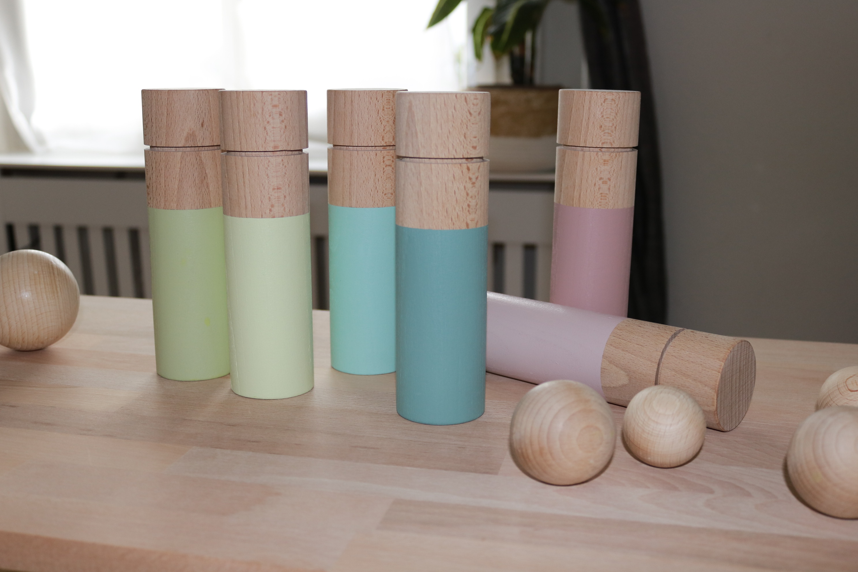 Das kleine Kegel-Set besteht aus 6 Kegeln und zwei Holzbällen. Das grosse Kegel-Set aus 9 Kegeln und drei Holzbällen
